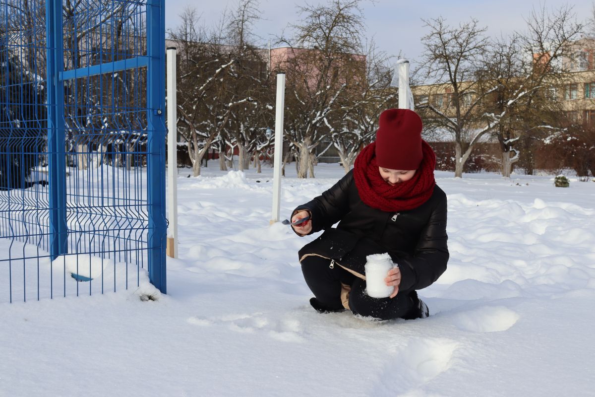 Даже сильный мороз не пугает юных экологов. Проничева Дарья, учащаяся объединения по интересам «Юные исследователи природы» (руководитель Егорова Н.И.), провидит исследовательскую работу «Определение чистоты снежного покрова г.Витебска». Снега в этом сезоне выпало немало и исследования можно провести с временным интервалом в несколько дней. Дарья определила высоту снежного покрова с помощью измерительной линейки. В настоящее время она составила 17 сантиметров. Взяла пробы снега на участке экологического отдела Витебского областного дворца детей и молодежи и в городе недалеко от перекрёстка пр-та Фрунзе и ул. Лазо.