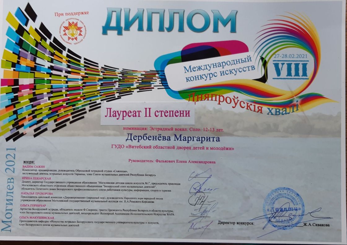 В период с 27 по 28 февраля в Могилёве прошёл VIII Международный конкурс искусств ”Дняпроўскія хвалі“. Этот замечательный город принял у себя в гостях более 400 коллективов и сольных исполнителей. Ребята от 5 до 17 лет продемонстрировали свои таланты в художественном чтении, театральном искусстве, хореографии, народном и эстрадном пении. Участие в конкурсе подарило детям незабываемые встречи с талантливыми и искренними сверстниками, с подлинным, живым и ярким миром детского творчества.