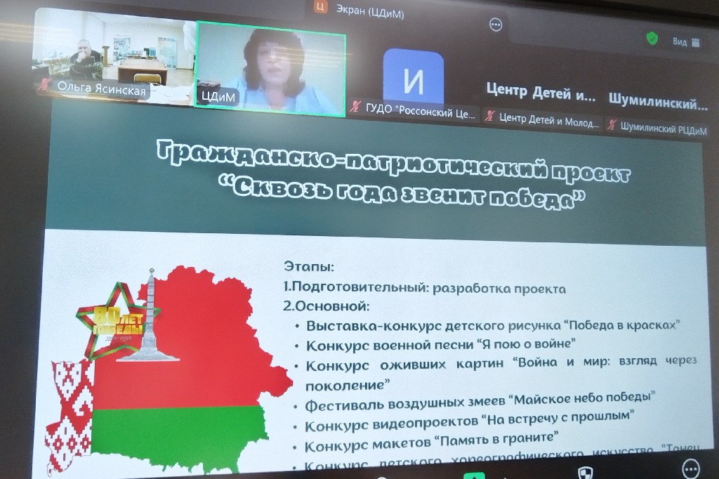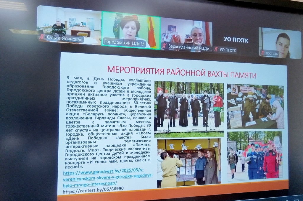 Об особенностях организации и проведения мероприятий в рамках Вахту Памяти рассказали Корнякова Валентина Николаевна, педагог-организатор Верхнедвинского районного центра детей и молодёжи, Семёнова Тамара Анатольевна, методист Городокского районного центра детей и молодёжи. Опытом проведения районного мероприятия «Партизанская тропа» поделился Зубко Кирилл Игоревич, заведующий отделом Россонского Центра детей и молодёжи. Полубинская Виктория Ивановна, методист Толочинского районного центра детей и молодёжи, презентовала районный проект «Сквозь года звенит Победа».