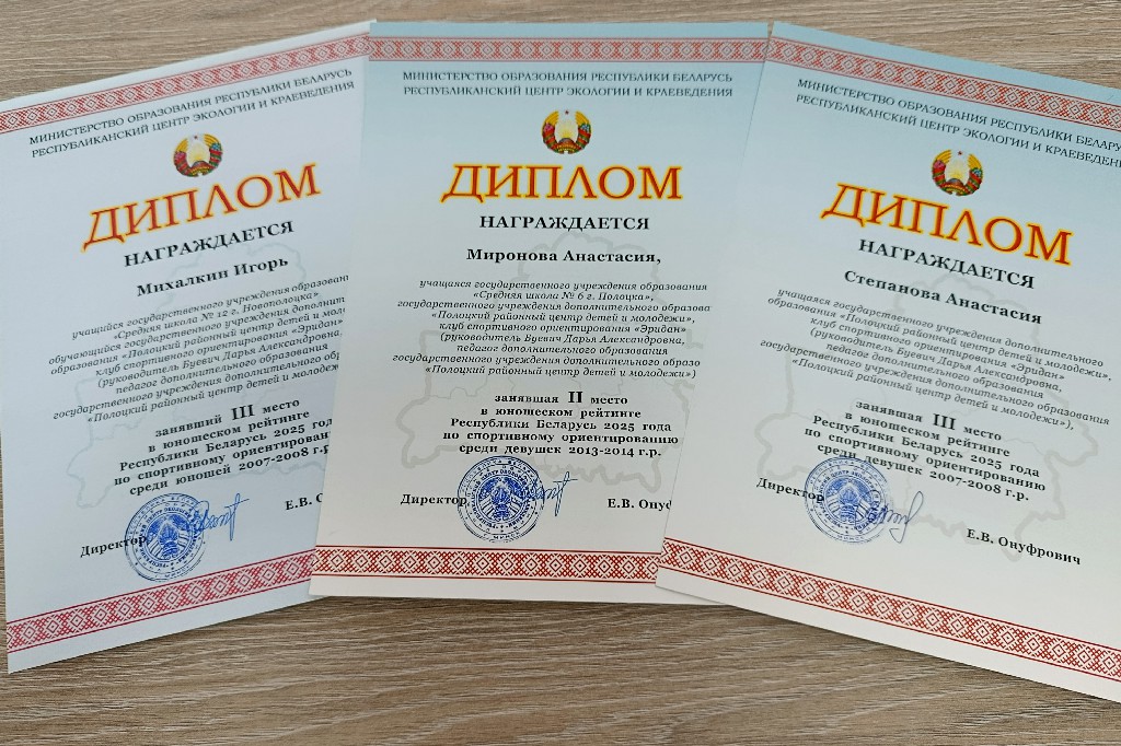 По итогам республиканского юношеского рейтинга по спортивному ориентированию 2025 года учащиеся ГУДО «Полоцкий районный центр детей и молодежи» Миронова Анастасия заняла II место, Степанова Анастасия и Михалкин Игорь – III места (педагог дополнительного образования Буевич Д.А.).